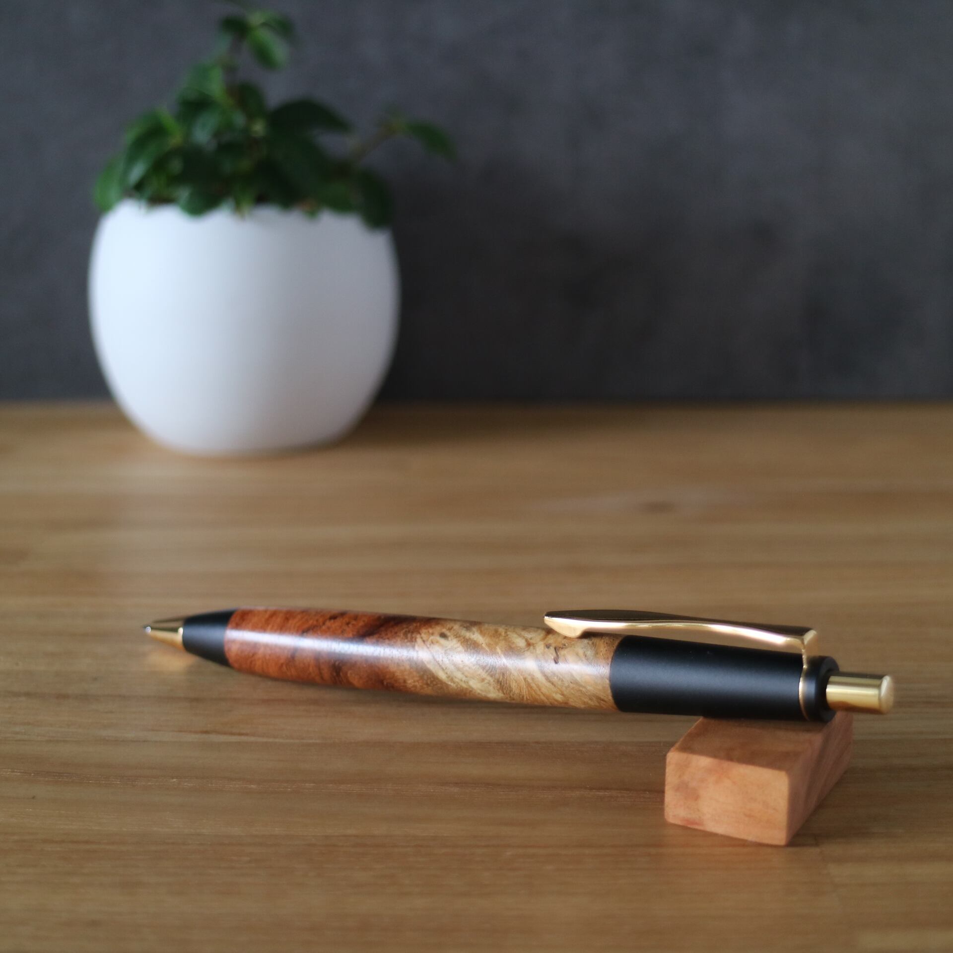 花梨はマメ科の広葉樹で、瘤杢(こぶもく)は成長過程で形成される独特の模様が特徴です。その複雑で立体的な木目は、幻想的な美しさを持ち、一本ごとに異なる模様が世界に一つだけの特別な存在感を放ちます。この瘤杢の自然な魅力を生かし、個性的でぬくもりのあるペンに仕上げました。