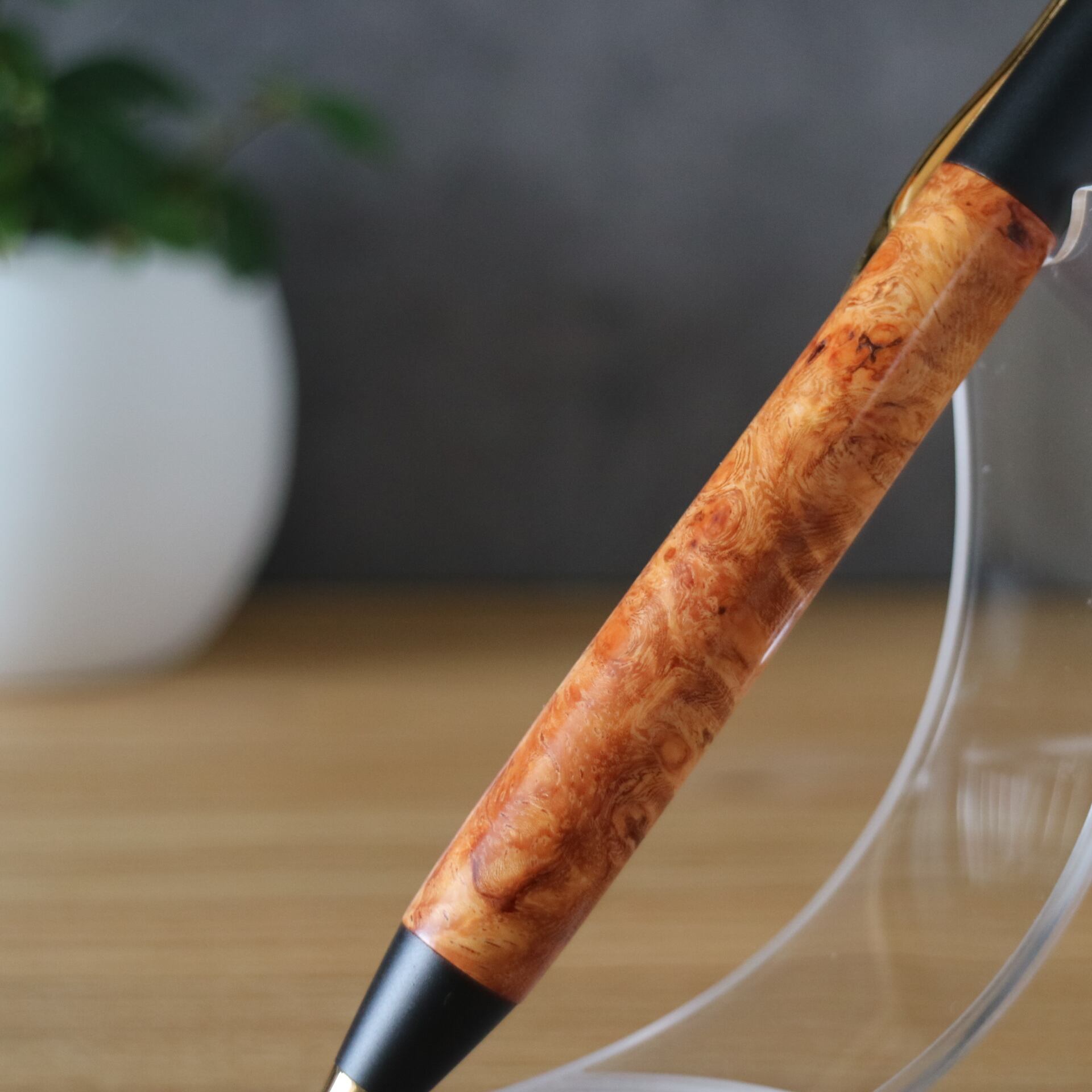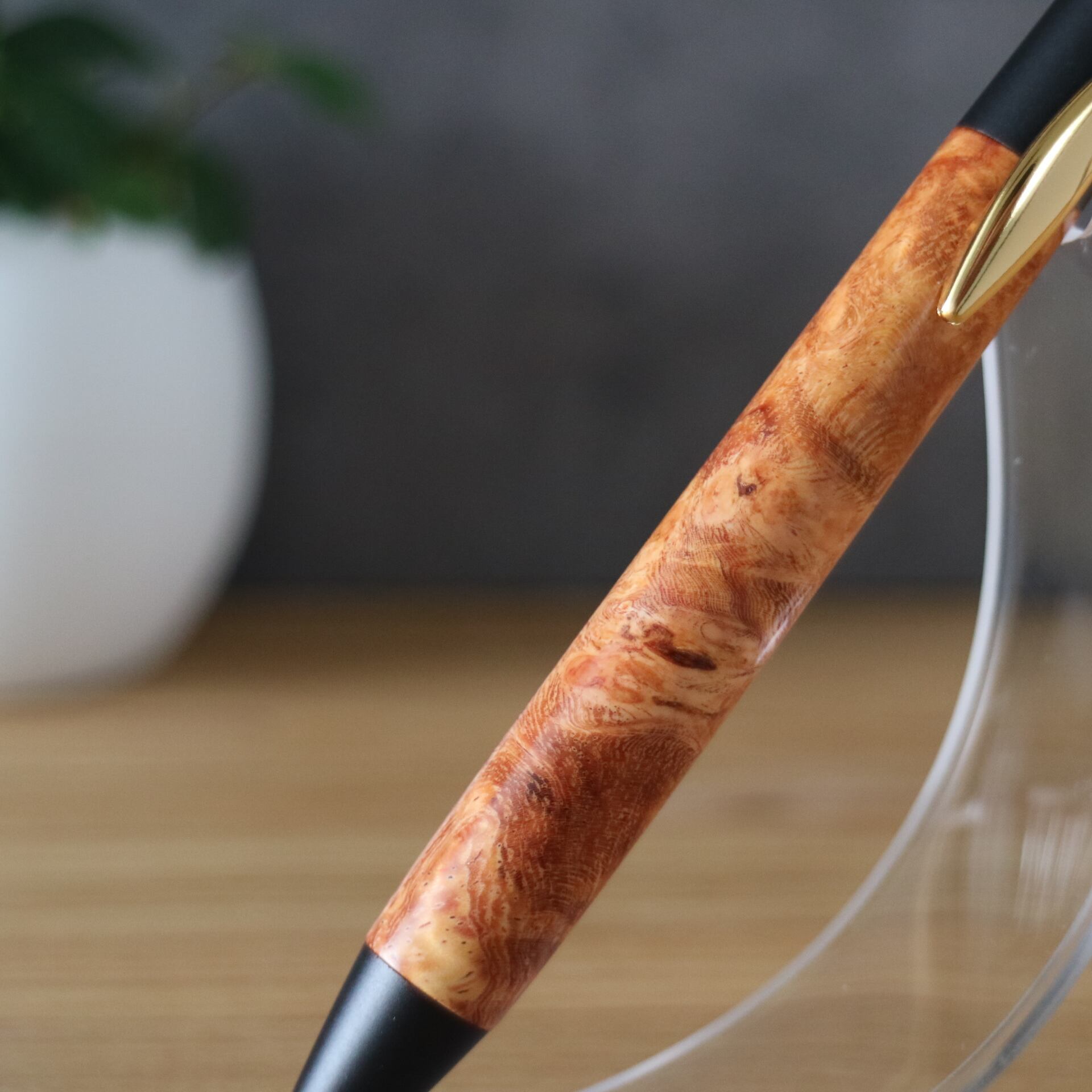 花梨はマメ科の広葉樹で、瘤杢(こぶもく)は成長過程で形成される独特の模様が特徴です。その複雑で立体的な木目は、幻想的な美しさを持ち、一本ごとに異なる模様が世界に一つだけの特別な存在感を放ちます。この瘤杢の自然な魅力を生かし、個性的でぬくもりのあるペンに仕上げました。