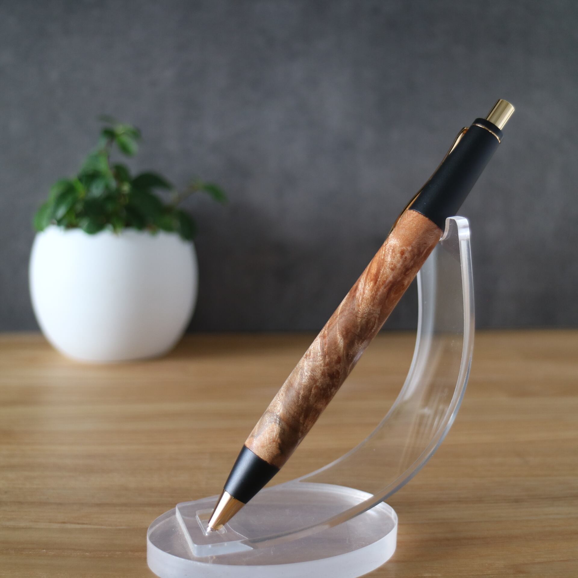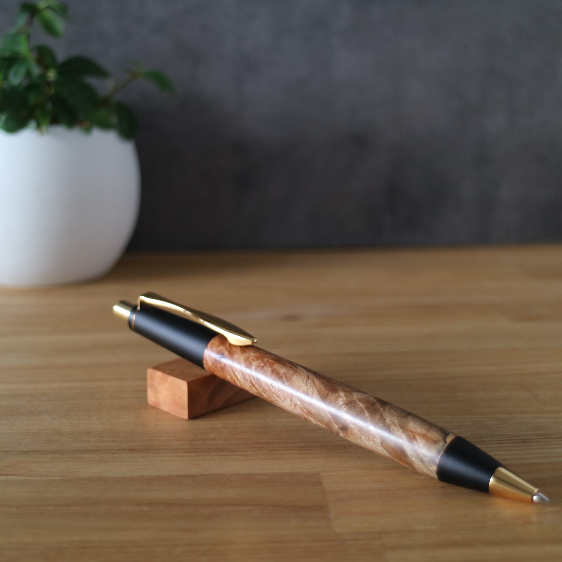 メープルの瘤材を使用した木軸ペンです。瘤杢(こぶもく)は成長過程で形成される独特の模様が特徴です。その複雑で立体的な木目は、幻想的な美しさを持ち、一本ごとに異なる模様が世界に一つだけの特別な存在感を放ちます。この瘤杢の自然な魅力を生かし、個性的でぬくもりのあるペンに仕上げました。