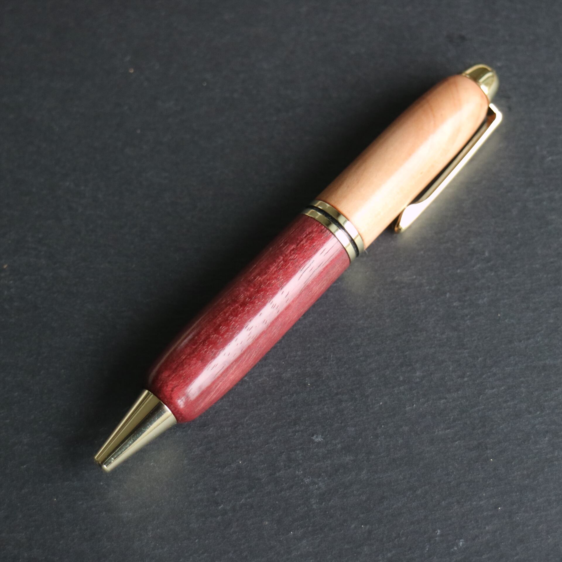 りんごの木はバラ科の広葉樹で、木目が詰まっていて滑らかな肌触りが特徴です。一方、パープルハートはマメ科の広葉樹で、削りたては鮮やかな紫色をしており、時間とともに深みのある色へと変化します。ミニサイズのペンは、システム手帳マイクロ5にぴったりです。