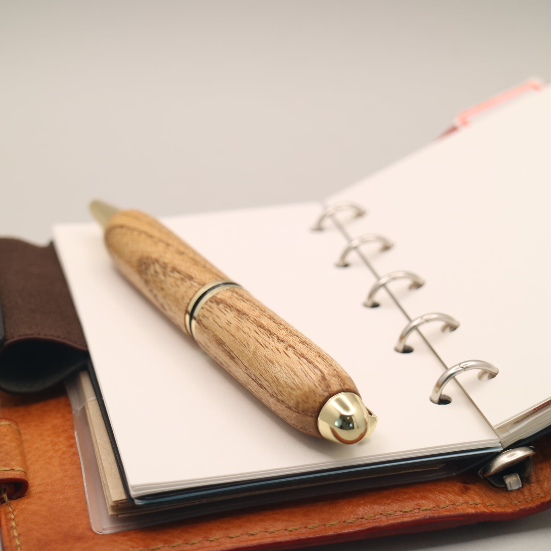 このミニボールペンは、エンジュの力強さと静けさをそのまま閉じ込め、全長約105mmのコンパクトな形に仕立てました。システム手帳マイクロ5やミニメモ帳にぴったりのサイズ感で、使うたびに凛とした空気をまとわせてくれます。