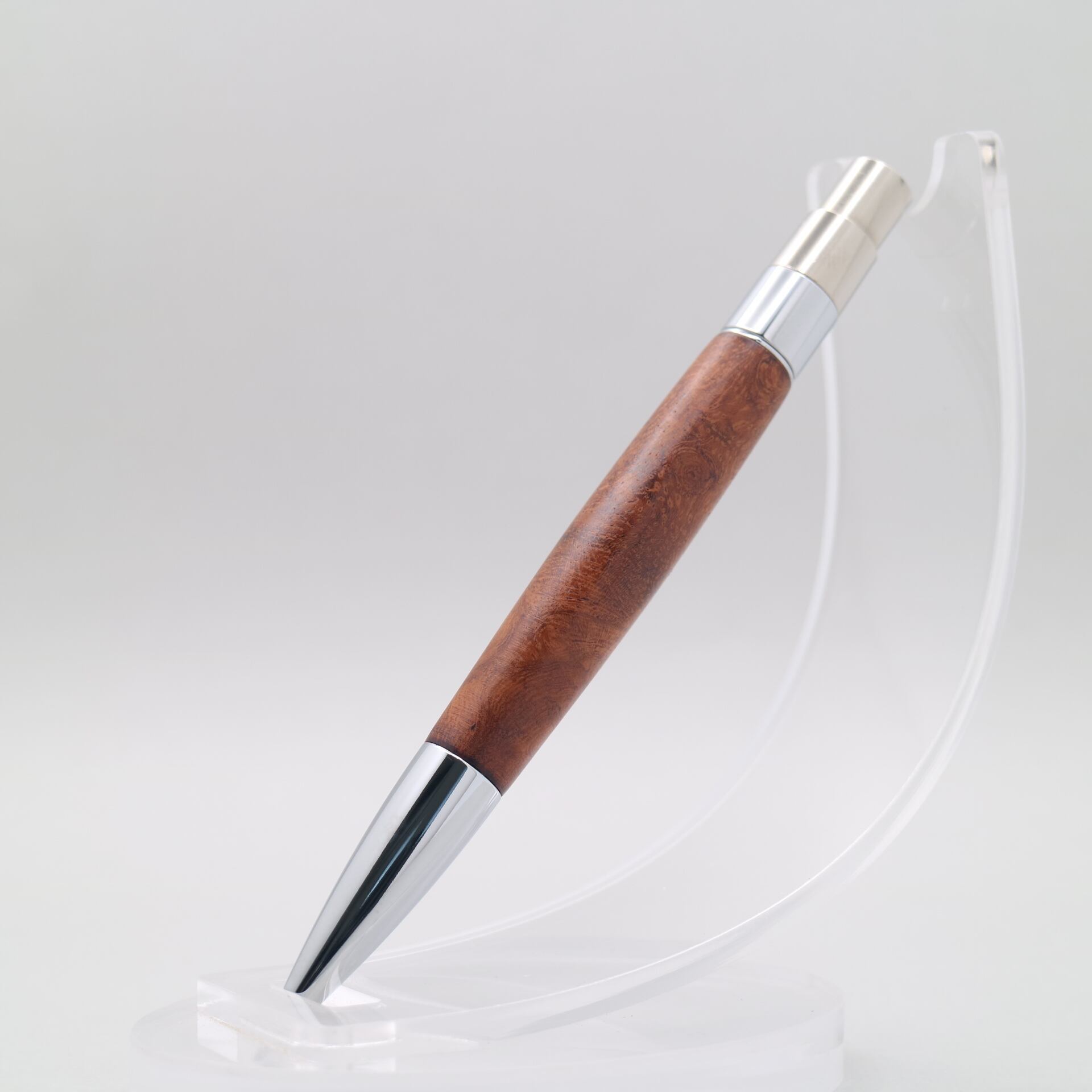 希少な部位「花梨瘤(かりんこぶ)」を用いた特別なペン。燃えるような赤や黄金色が複雑に交わり、力強くうねる木目が、一本の中に存在感を宿します。その模様は見る角度によって表情を変え、まるで抽象画のような幻想的な世界を描き出します。