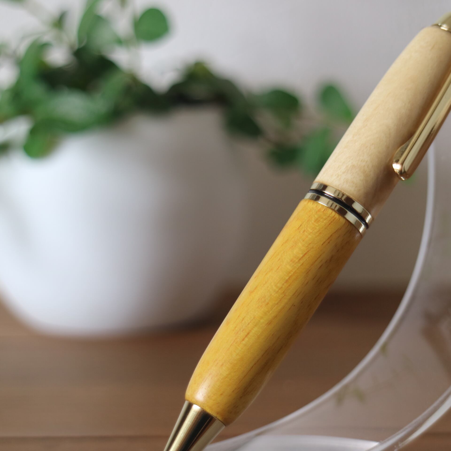 みかんはミカン科の広葉樹です。肌目は滑らかで、程よい硬さのある材です。白色と黄色が混ざり合い全体的にさわやかな印象を与えます。ハゼはウルシ科の広葉樹です。美しい黄色が特徴です。年輪ははっきりしており、肌目は粗めです。システム手帳マイクロ5にちょうど良いミニサイズで、文字を書くのが楽しくなり、長く愛用できる一本となるよう心掛けて作りました。