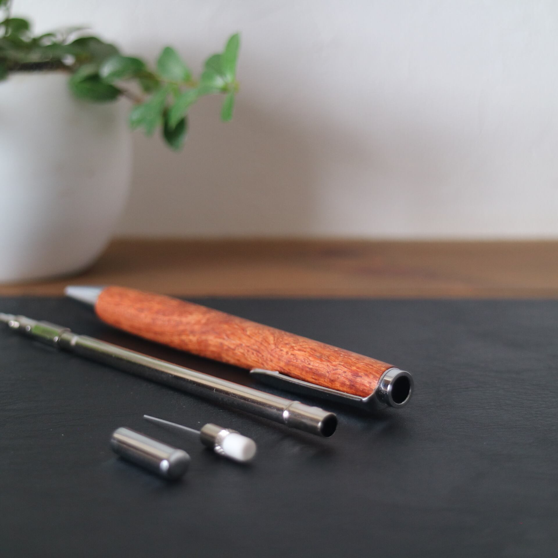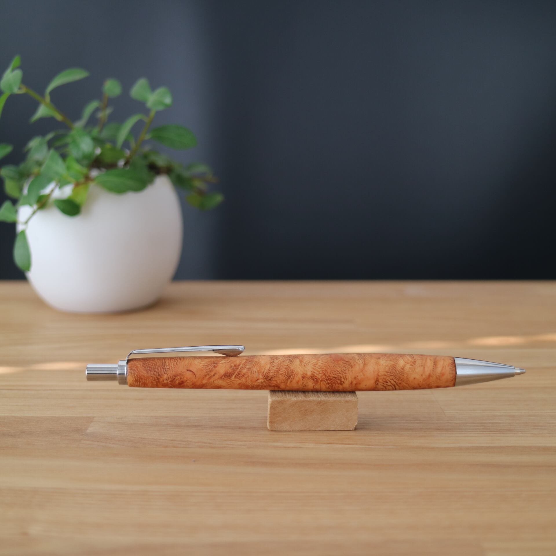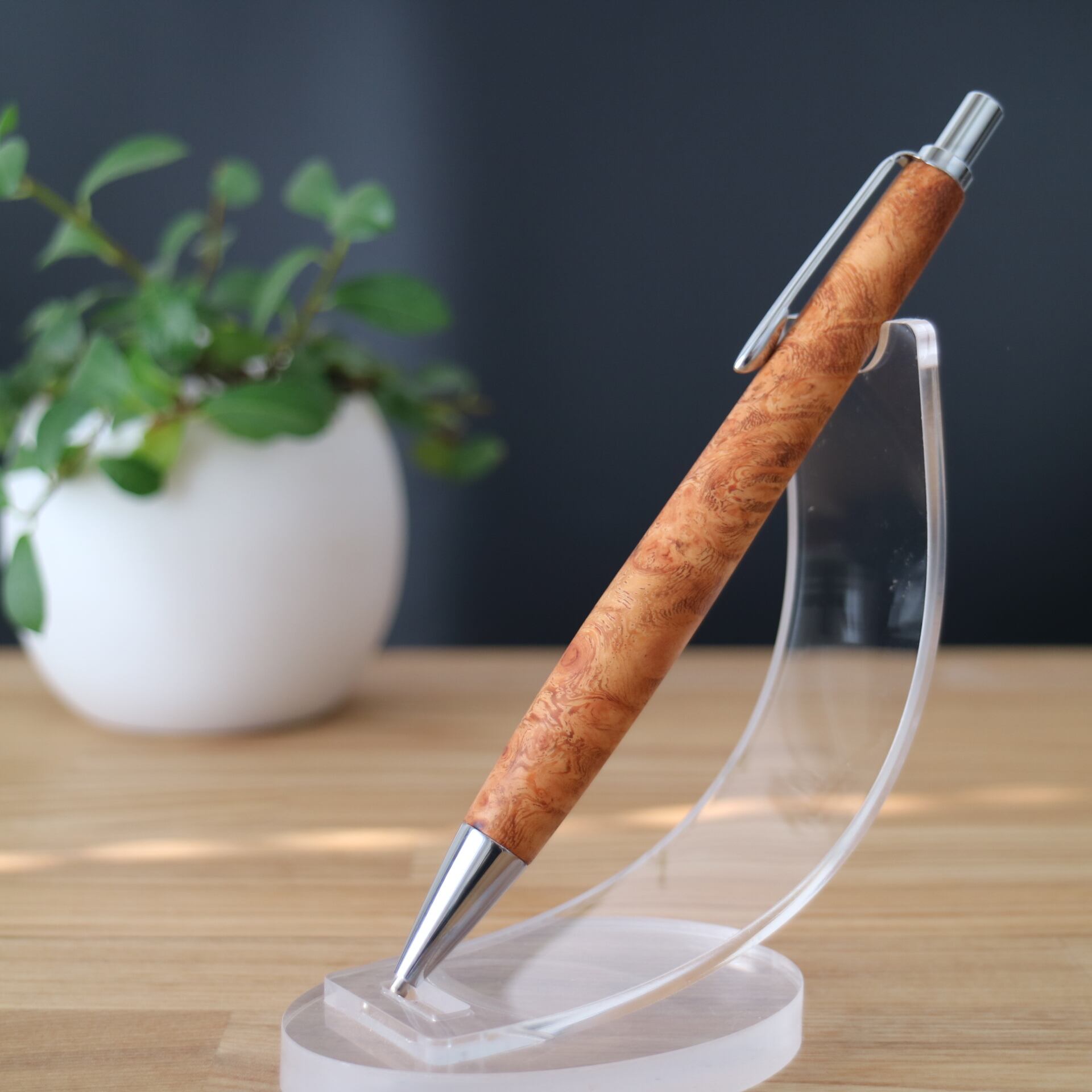 花梨(かりん)はマメ科の広葉樹で、その特徴的な瘤杢(こぶもく)は、成長過程で自然に生まれる独特な模様です。この複雑で立体的な木目は幻想的な美しさを持ち、一本ごとに異なる模様が、そのペンに唯一無二の特別な存在感を与えます。そんな瘤杢の自然な美しさを活かし、個性と温もりあふれる一本に仕上げました。