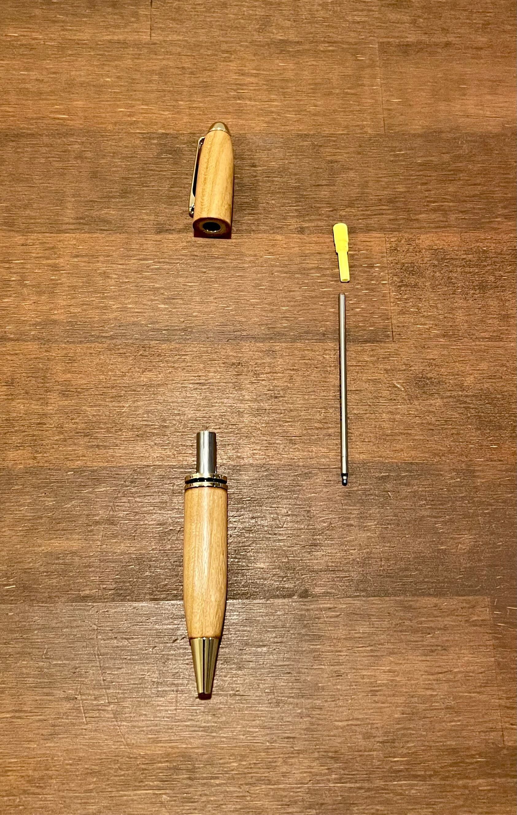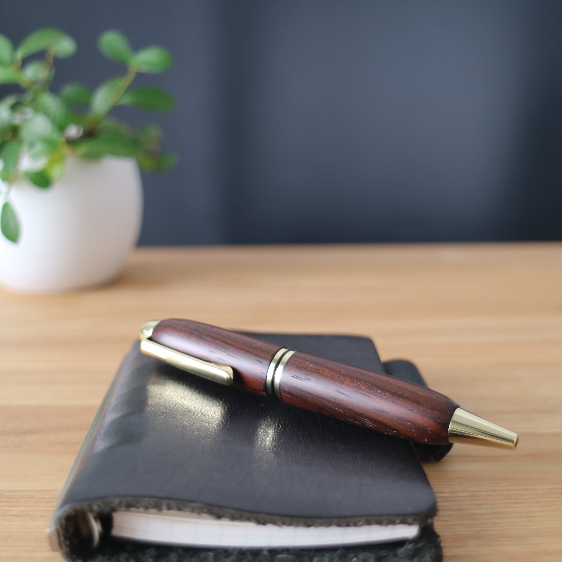本紫檀はマメ科の広葉樹でローズウッドの仲間です。木質は重くてかたく、加工後の表面はなめらかです。材面が美しいことから、唐木細工、高級家具、キャビネットなどに使われています。システム手帳マイクロ5にちょうど良いミニサイズで、文字を書くのが楽しくなり、長く愛用できる一本となるよう心掛けて作りました。