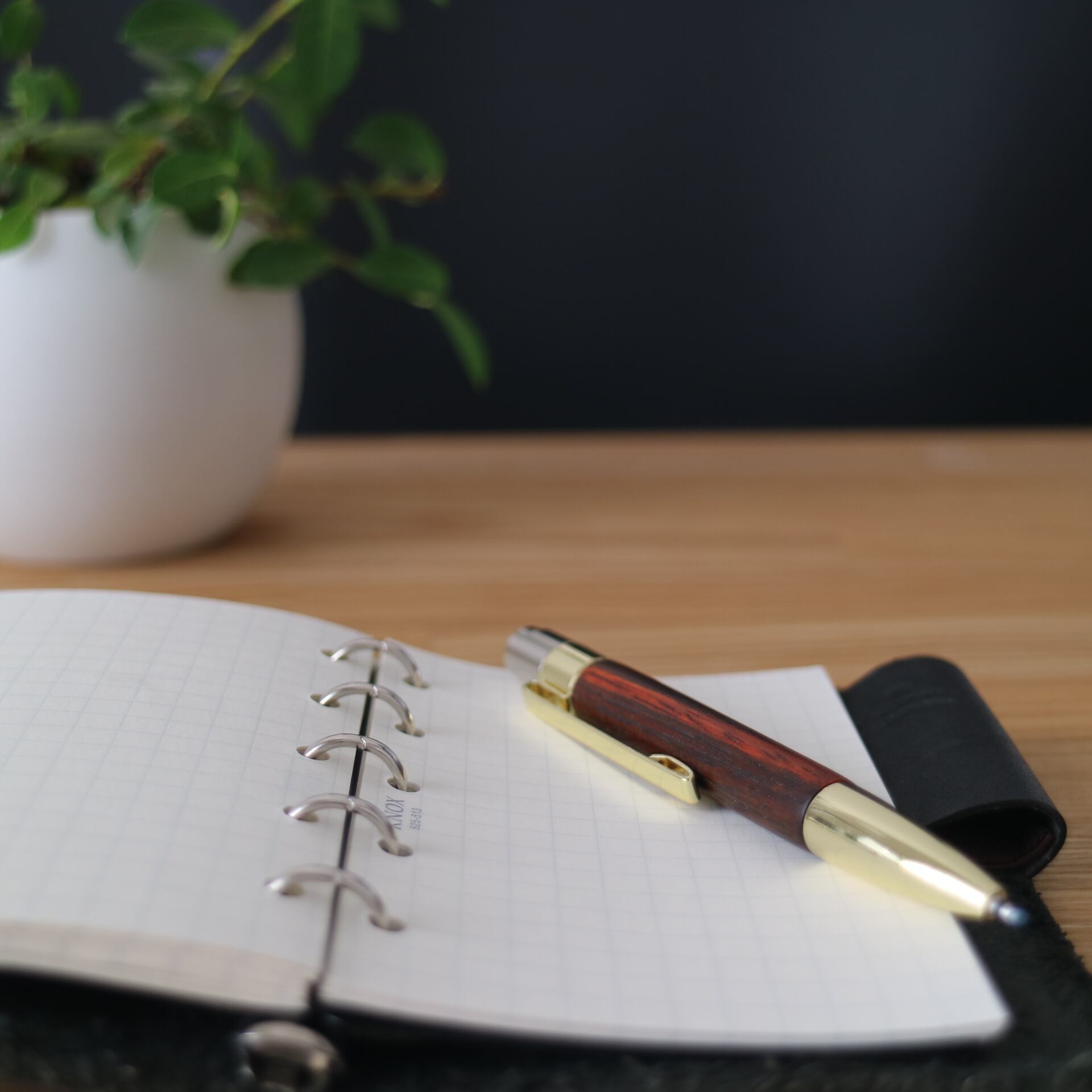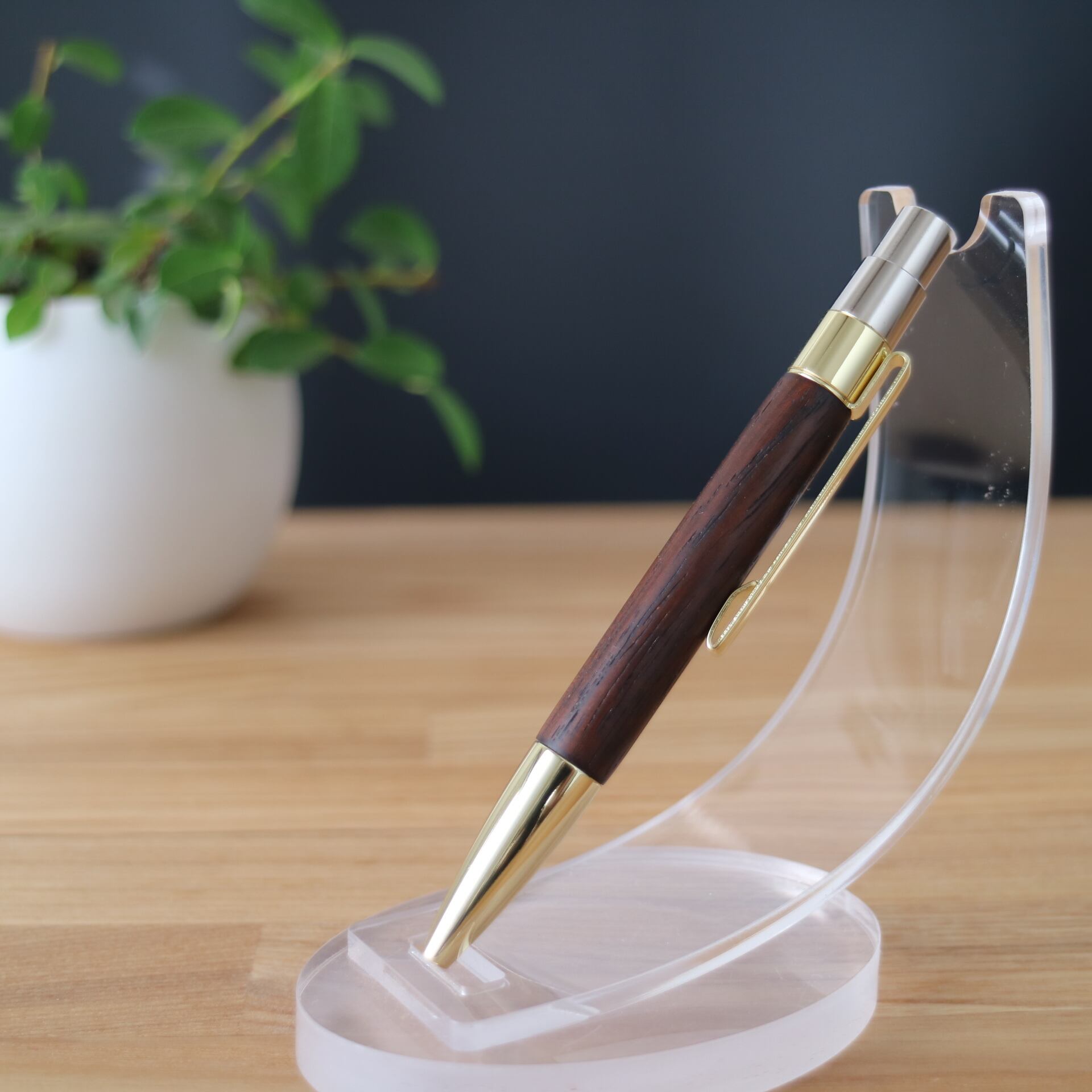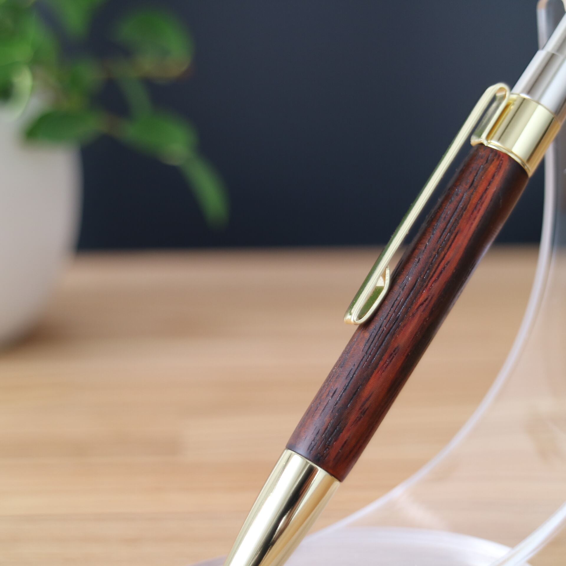 本紫檀はマメ科の広葉樹でローズウッドの仲間です。木質は重くてかたく、加工後の表面はなめらかです。材面が美しいことから、唐木細工、高級家具、キャビネットなどに使われています。システム手帳マイクロ5にちょうど良いミニサイズで、文字を書くのが楽しくなり、長く愛用できる一本となるよう心掛けて作りました。