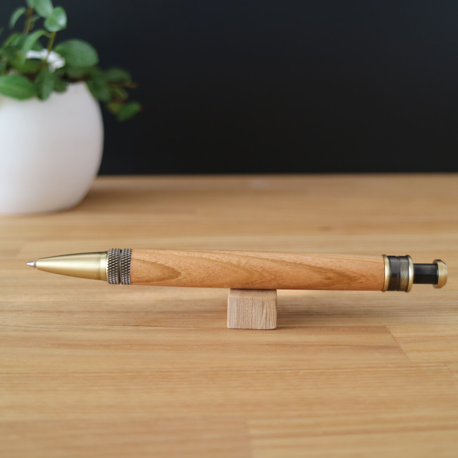 このボールペンは、手にしっかり馴染む太軸デザインと、使いやすいノック式を採用しています。アンティーク調の金具が全体の雰囲気を引き立て、文字を書く楽しさがより一層感じられる一本に仕上げました。日々の筆記のお供として、長く愛用できる一本となるよう心掛けて作りました。