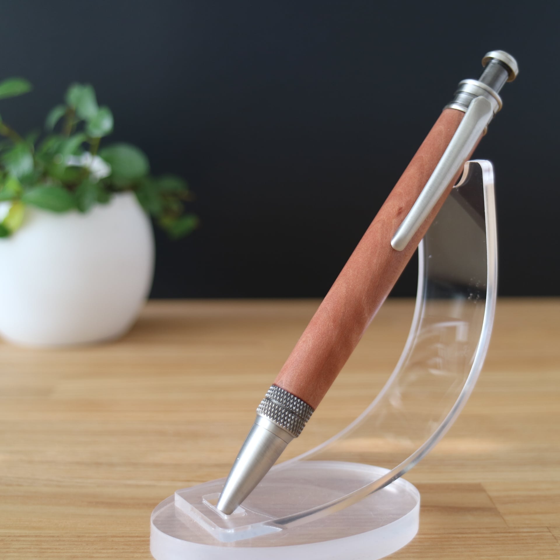 このボールペンは、手にしっかり馴染む太軸デザインと、使いやすいノック式を採用しています。アンティーク調の金具が全体の雰囲気を引き立て、文字を書く楽しさがより一層感じられる一本に仕上げました。日々の筆記のお供として、長く愛用できる一本となるよう心掛けて作りました。