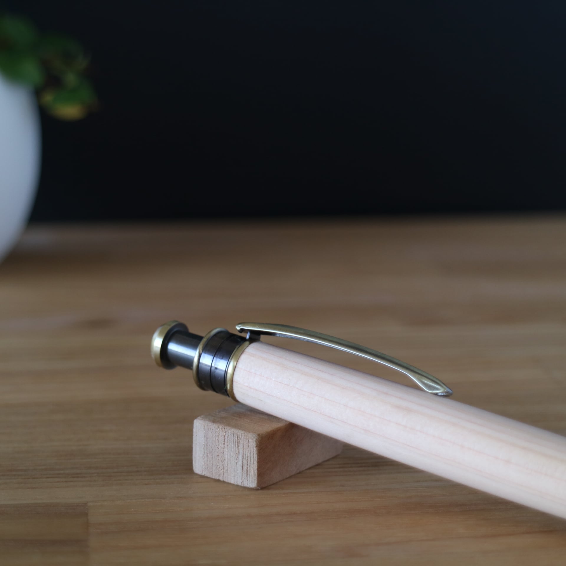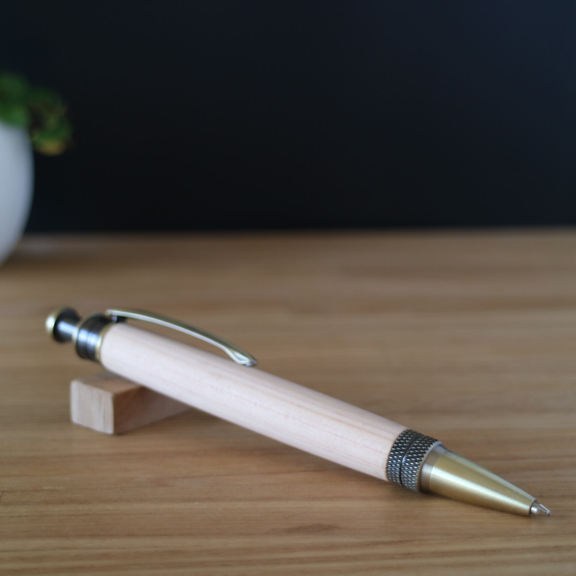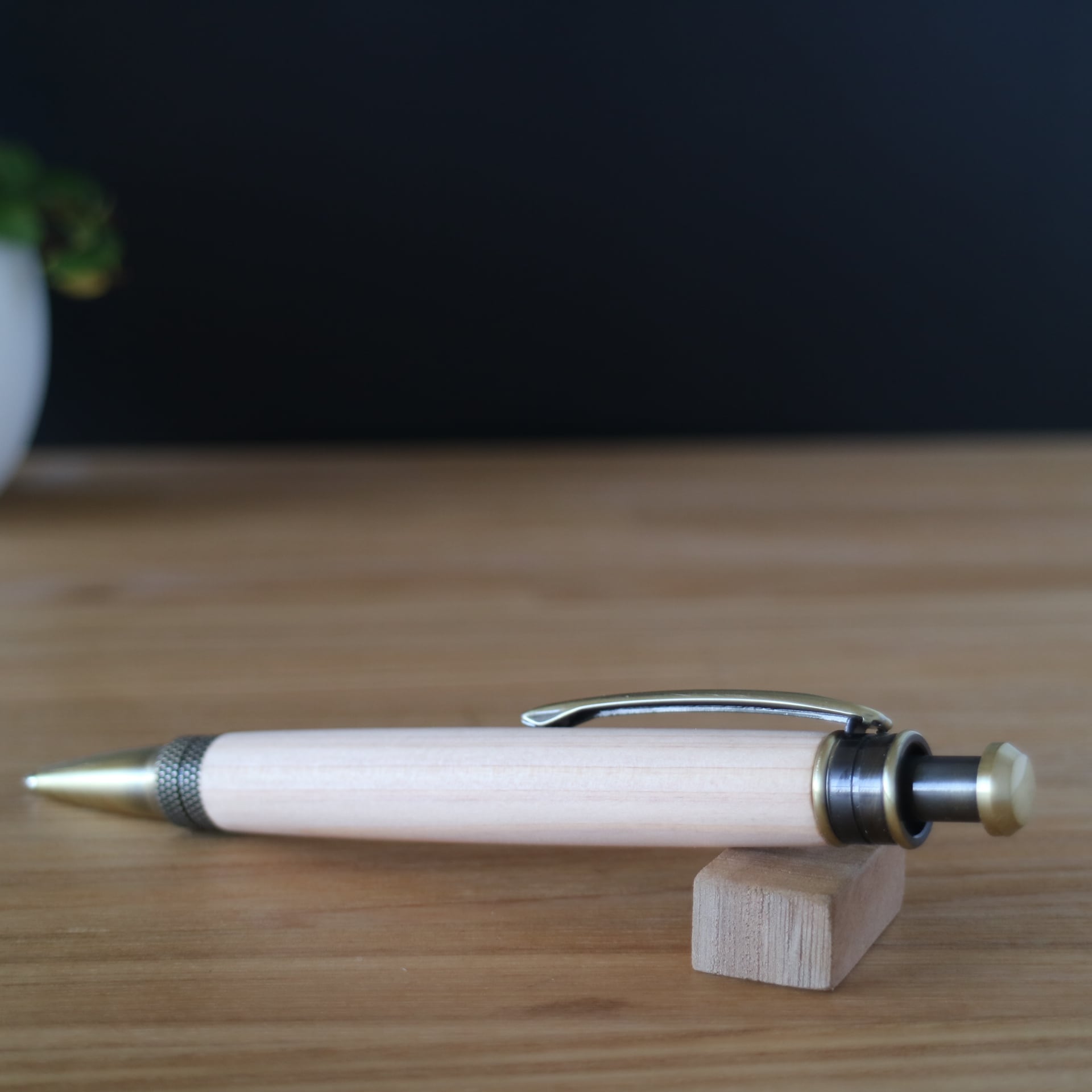 手に馴染む太軸デザインと便利なノック式を採用し、アンティーク調の金具が上品な雰囲気を演出します。日々の筆記が楽しくなる一本として、丁寧に仕上げました。
