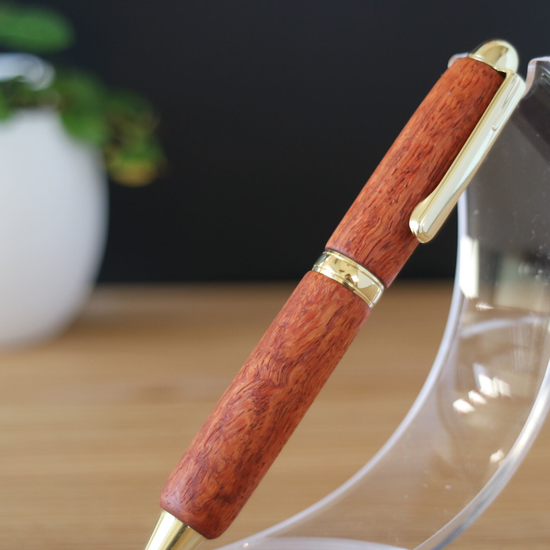 花梨を使用したノック式ミニボールペンです。緻密に入り組んだ不思議な模様が美しい一本に仕上がりました。システム手帳マイクロ5にちょうど良いミニサイズで、文字を書くのが楽しくなり、長く愛用できる一本となるよう心掛けて作りました。